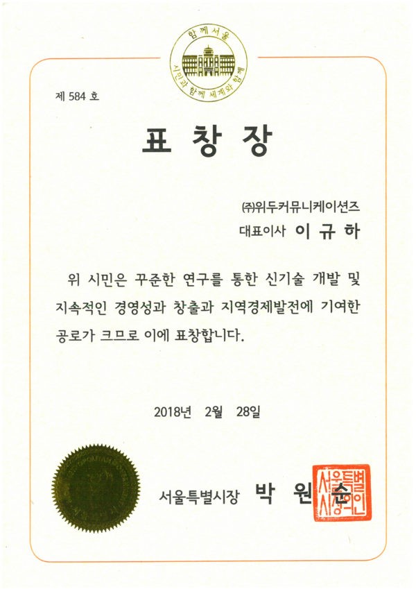 서울특별시장 표창장 페이지 정보 작성자 WeDu 댓글 0건 조회 6,314회 작성일 19-05-30 19:35 본문 2018-02-28 표창장 제 584호 신기술 개발 및 지속적인 경영성 창출, 지역 경제 발전 기여 서울특별시장 박원순 List Previous2018 소년한국 우수 어린이 도서 19.05.30 Next서울클러스터 어워드 우수상 19.05.30